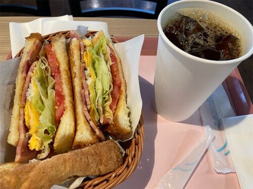 生協の2階にある サンドイッチ 飲食スペース 改めて 生協の2階にある 佐世保バーガーのサンドイッチ。少し前に食べたら旨かったので、また食べに来た。好きな味ですね。トーストしているからかな、それともべーコンのせいかな...。よく買い物に行く〈みや…